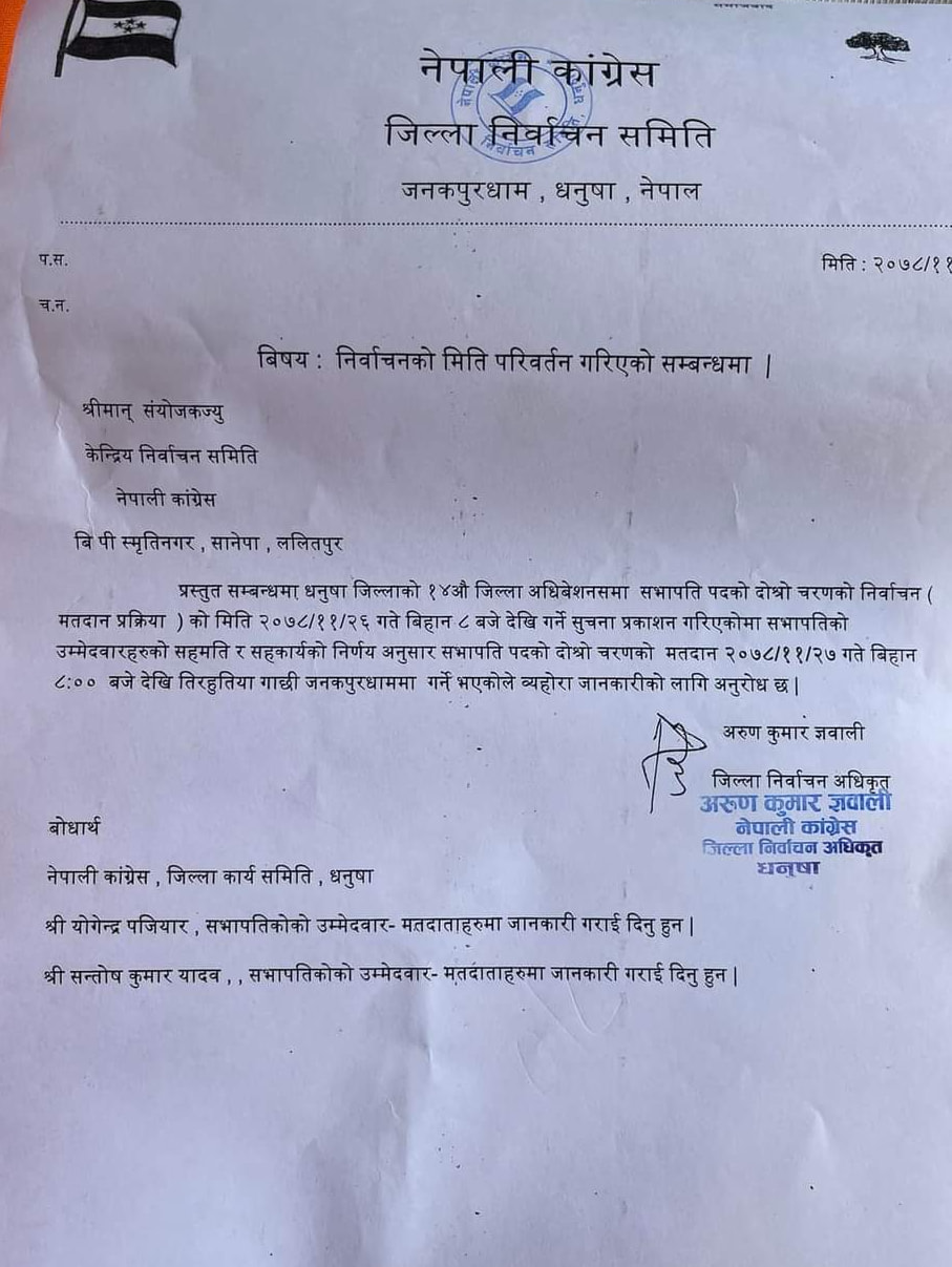 नेपाली कांग्रेस जिल्ला निर्वाचन समितिले निर्वाचनको मिति परिवर्तन गरेको हो ।