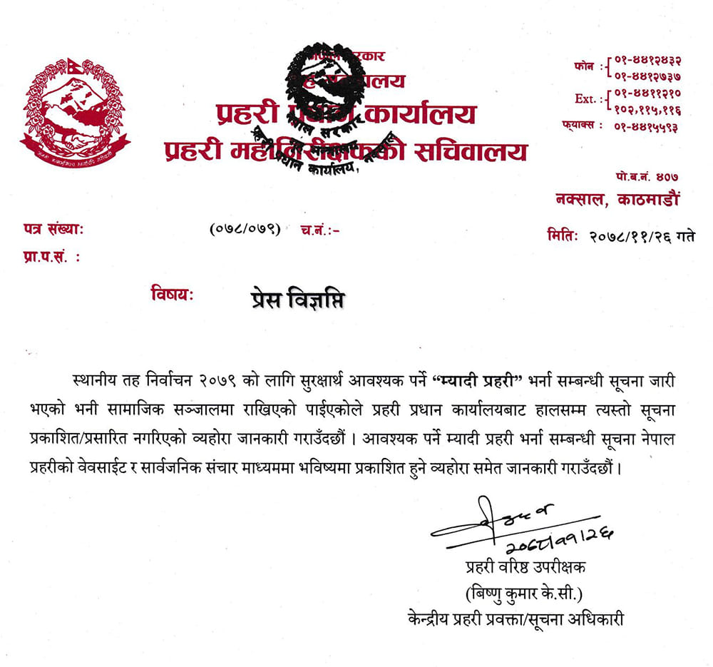 आवश्यक पर्ने म्यादी प्रहरीका सम्बन्धमा नेपाल प्रहरीको वेबसाइट र सार्वजनिक सञ्चार माध्यमबाट भविष्यमा प्रकाशित हुने प्रहरी प्रवक्ता प्रहरी वरिष्ठ उपरीक्षक विष्णुकुमार केसीद्वारा जारी विज्ञप्तिमा उल्लेख छ ।