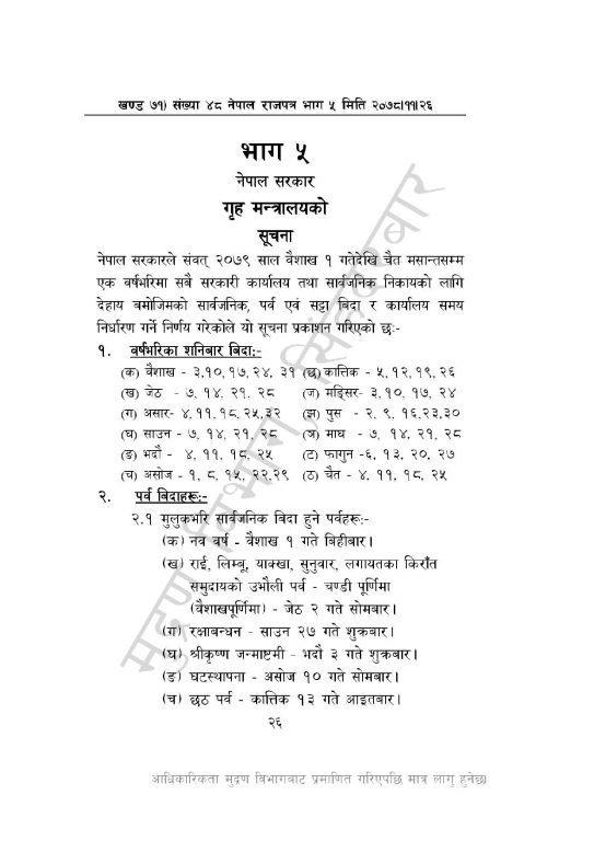गृह मन्त्रालयले २०७९ साल बैशाख १ गतेदेखि चैत मसान्तसम्म एक वर्षभरिका सबै सरकारी कार्यालय तथा सार्वजनिक निकायका लागि शनिबारबाहेक ४३ दिन बिदा दिने निर्णय गरेको हो ।