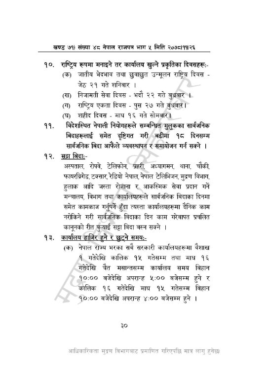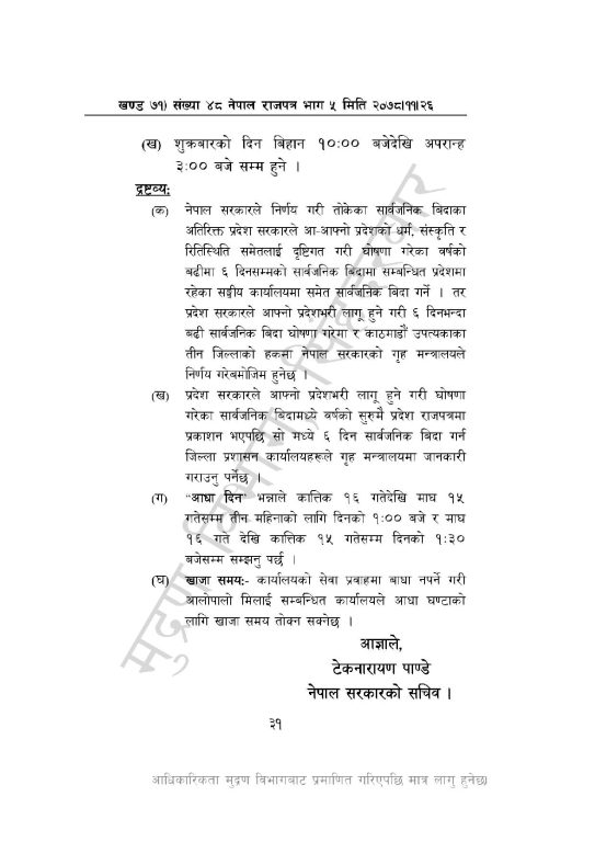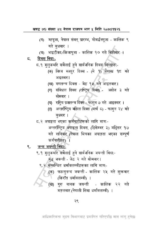 सार्वजनिक बिदाको दिन बाहेक वर्षभरिमा ५२ दिन भने शनिबार बिदा हुनेछ ।