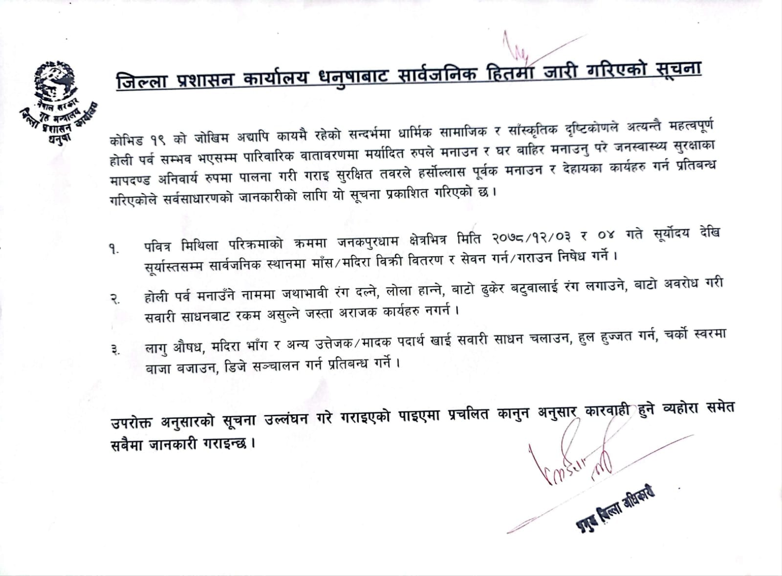 जिल्ला प्रशासन कार्यालय धनुषाले बुधबार एक विज्ञप्ति जारी गर्दै चैत ३ र ४ गते जनकपुरधाम क्षेत्रमा माँसमदिरा विक्रिवितरण तथा सेवन निषेधित गरिएको जनाएको छ ।