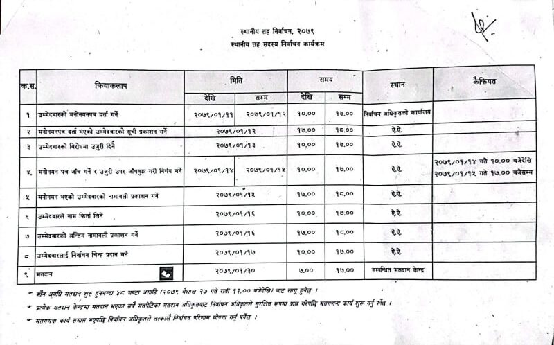 स्थानीय निर्वाचनका लागि ११ र १२ वैशाखमा मनोनयन दर्ताको मिति तोकियो