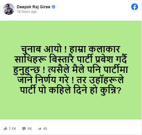 ‘चुनाव आयो ! हाम्रा कलाकार साथीहरू विस्तारै पार्टी प्रवेश गर्दै हुनुहुन्छ ! त्यसैले मैले पनि पार्टीमा जाने निर्णय गरेँ ! तर उहाँहरूले पार्टी पो कहिले दिने हो कुन्नि?’, गिरीले फेसबुकमा व्यंग्य गरेका छन् ।