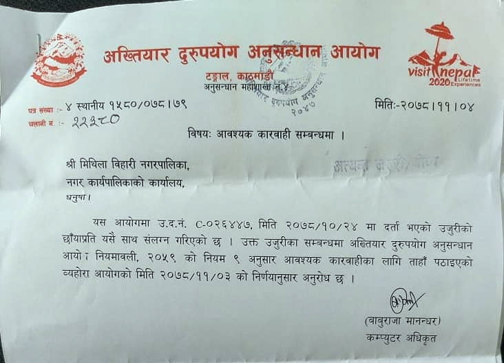 उजुरी परेपछि अख्तियार आयोगले २०७८ फागुन ४ मा मिथिला बिहारी नगरपालिकाको कार्यालयलाई पत्र पठाएर त्यहाँका प्रमुख प्रशासकीय अधिकृतलाई छानबिन गरी आवश्यक कारबाहीका लागि पत्राचार गरेको समेत छ ।