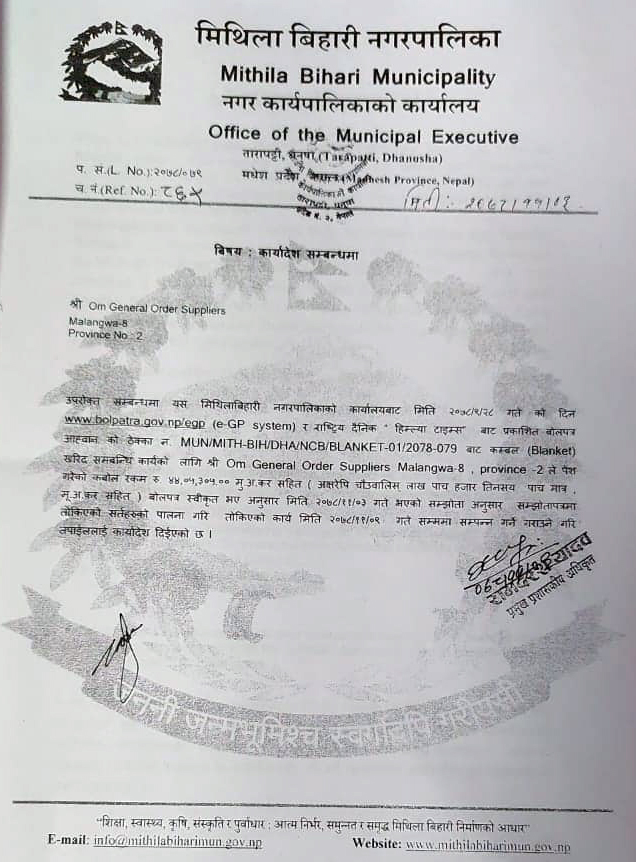 ‘२०७८ पुस २८ गते प्रकाशित बोलपत्रबाट कम्बल खरिद सम्बन्धी कार्यका लागि ओम जनरल अर्डर सप्लायर्सले पेश गरेको कबोल रकम ४४ लाख ५ हजार ३०५ रुपैयाँ मूल्य अभिवृद्धि करसहित बोलपत्र स्वीकृत अनुसार २०७८ फागुन ३ मा सम्झौता भएको थियो । सो अनुसार सम्झौता पत्रमा तोकिएको शर्तहरूको पालना गरी तोकिएको कार्य २०७८ फागुन ९ गतेसम्ममा सम्पन्न गर्ने गराउने गरी तपाईंलाई कार्यादेश दिइएको छ,’ निमित्त प्रमुख प्रशासकीय अधिकृत यादवले ओम जनरल अर्डर सप्लायर्सलाई दिएको कार्यादेश पत्रमा उल्लेख छ ।