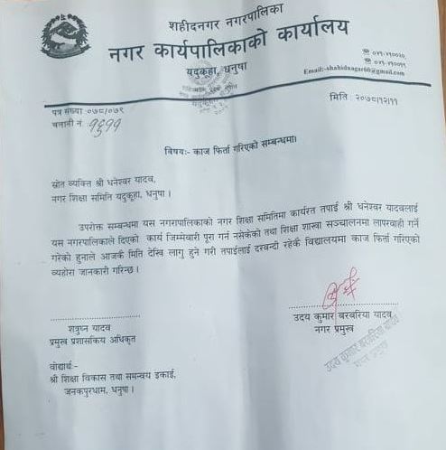 नगरपालिका कार्यालयको चलानी नम्बर १६११ अनुसार शिक्षा शाखा प्रमुख यादवलाई काम फिर्ता गरिएको लेखिएको छ ।