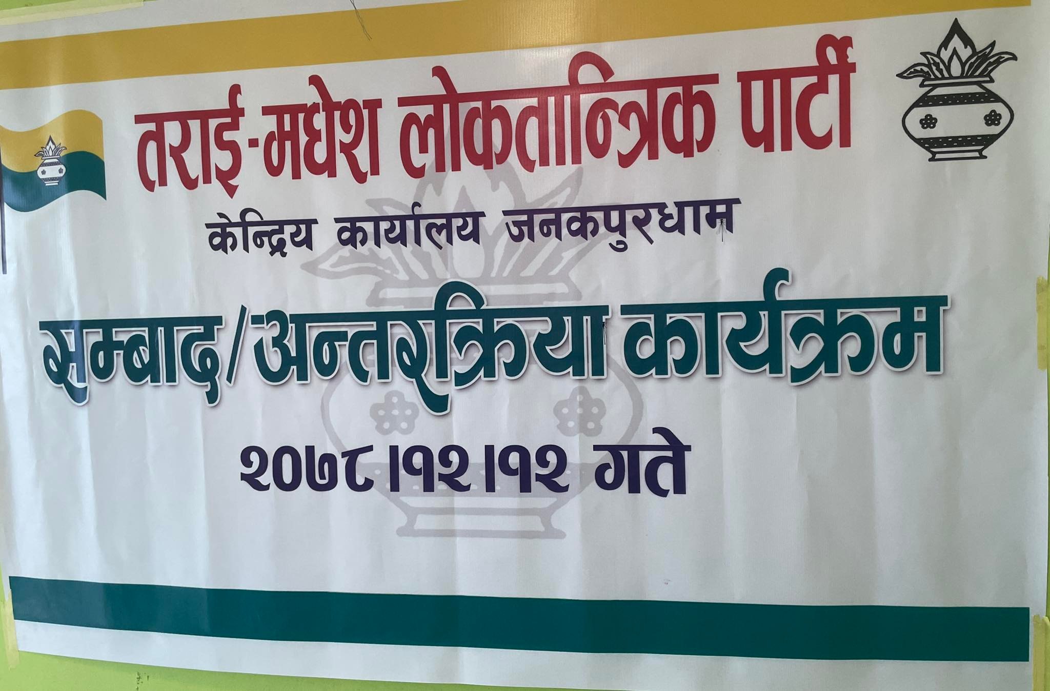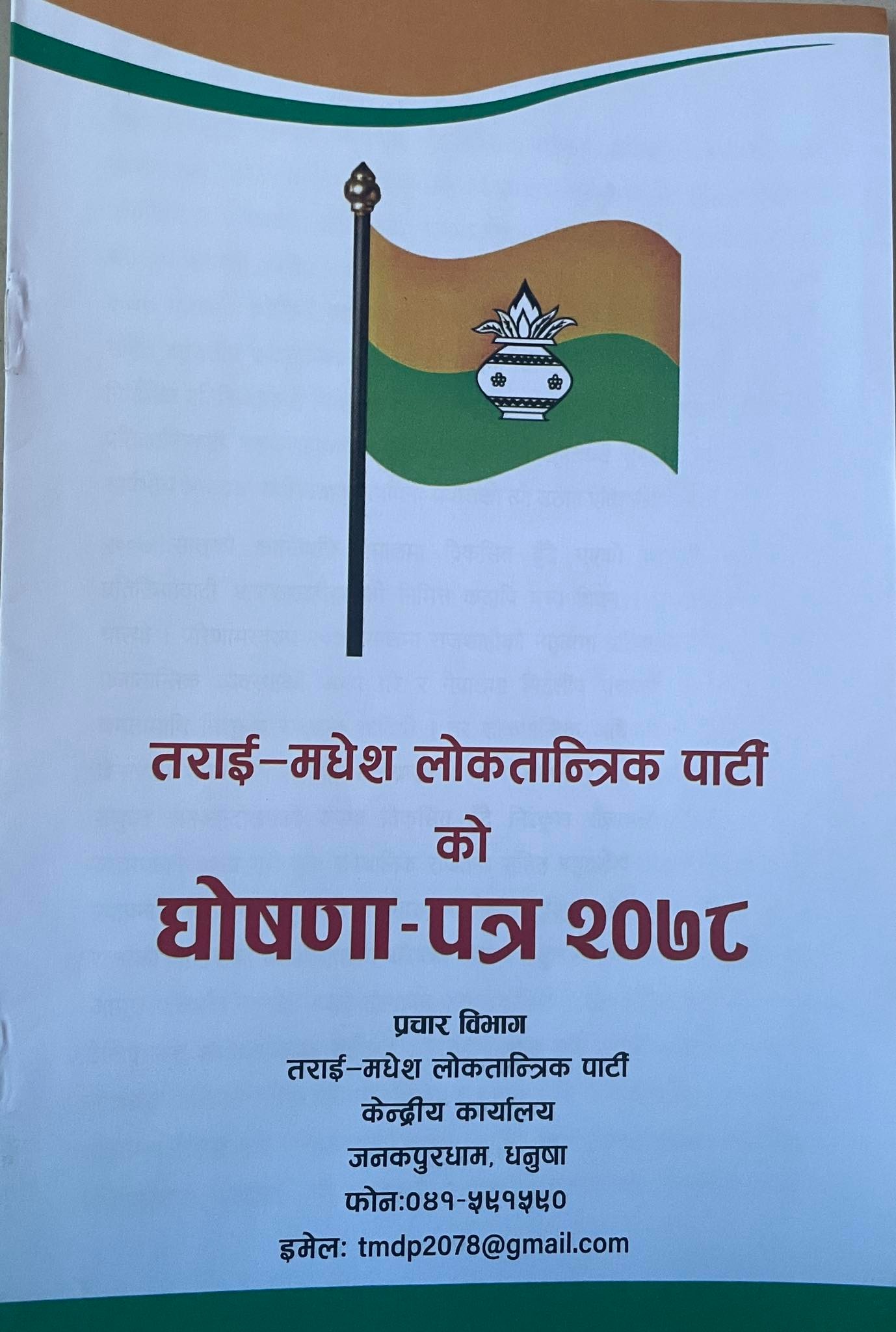 शनिबार जनकपुरधाममा पार्टी अध्यक्ष तथा वरिष्ठ नेता र जिल्ला अध्यक्षहरुको उपस्थितिमा १५ बुँदे घोषणापत्र सार्वजनिक गरिएको हो ।
