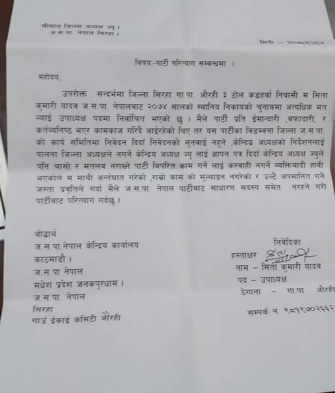 सिरहा, १७ चैत । सिरहाको औरही गाउँपालिकाकी उपाध्यक्ष सीताकुमारी यादव जनता समाजवादी पार्टी नेपाल परित्याग गरेकी छन् ।