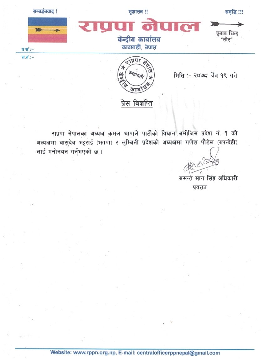 राप्रपा नेपालका प्रवक्ता वसन्तमानसिंह अधिकारीले शनिबार एक विज्ञप्ति जारी गर्दै दुईवटा प्रदेशमा पार्टी अध्यक्ष मनोनयन गरिएको जानकारी दिएका छन् ।