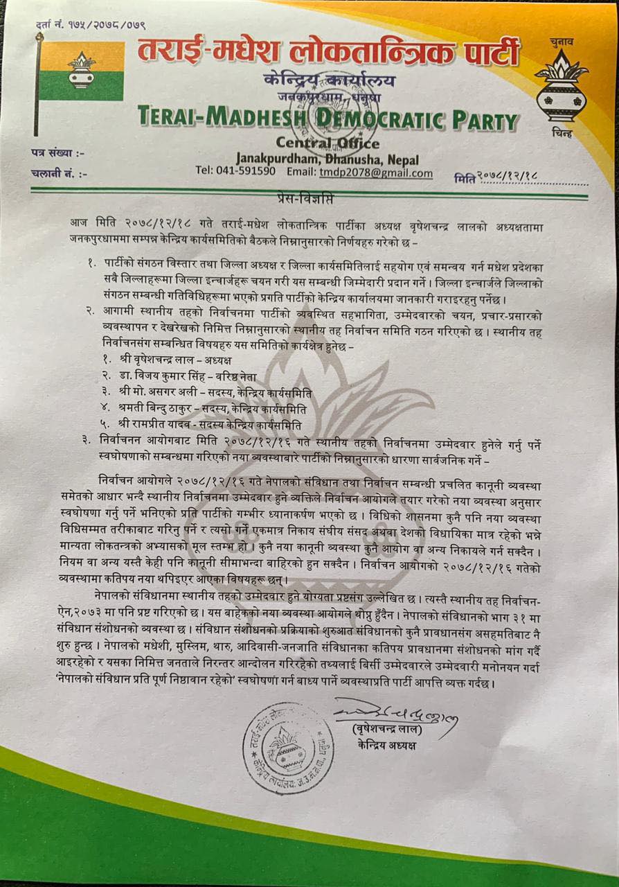 बैठकपश्चात अध्यक्ष लालले जारी गरेको विज्ञप्तीमा भनिएको छ,‘नेपालको मधेशी, मुस्लिम, थारु, आदिवासी–जनजाति संविधानका कतिपय प्रावधानमा संशोधनको माग गर्दै आइरहेको र यसका निमित्त जनताले निरन्तर आन्दोलन गरिरहेको तथ्यलाई बिर्सी उम्मेदवारले उम्मेदवारी मनोनयन गर्दा ‘नेपालको संविधानप्रति पूर्ण निष्ठावान रहेको’ स्वघोषणा गर्न बाध्य पार्ने व्यवस्थाप्रति पार्टी आपत्ति व्यक्त गर्दछ ।’