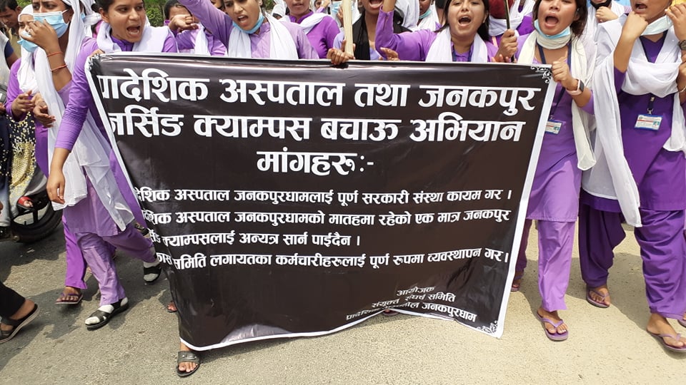 जनकपुरधाम, २५ चैत । मधेस प्रदेश सरकारले प्रादेशिक अस्पताल जनकपुरलाई मधेस स्वास्थ्य विज्ञान प्रतिष्ठान अन्तर्गत राखेपछि स्वास्थ्यकर्मीहरु आन्दोलित भएका छन् ।