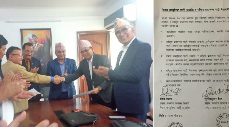 काठमाडौं, ३० चैत । नेकपा एमाले र कमल थापा नेतृत्वको राप्रपा नेपालबीच स्थानीय तह निर्वाचनमा सहकार्य गर्ने सहमति भएको छ ।