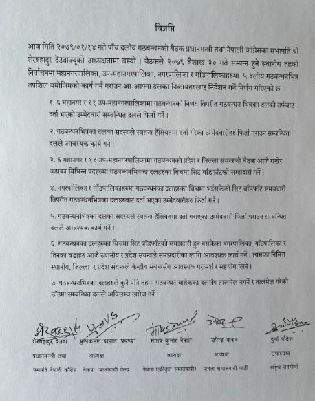 गठबन्धनभित्रका दलका सदस्यले स्वतन्त्र हैसियतमा दर्ता गराएका उम्मेदवारी फिर्ता गराउन सम्बन्धित दलले आवश्यक कार्य गर्नसमेत बैठकले निर्देशन दिएको छ ।