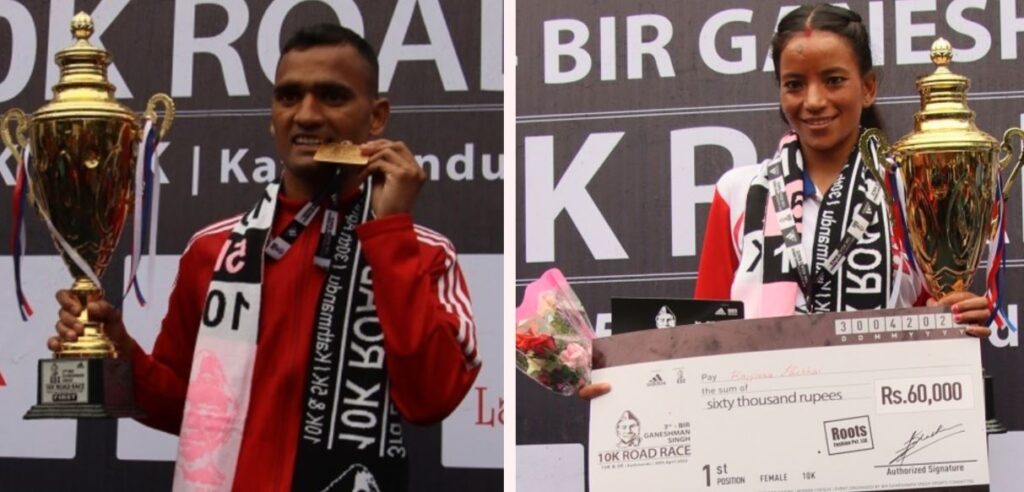 काठमाडौं, १७ बैशाख । एपिएफका गोपीचन्द्र पार्की र नेपाल पुलिस क्लबकी राजपुरा पछाईले तेस्रो संस्करणको वीर गणेशमानसिंह १० किलोमिटर रोडरेस प्रतियोगिताको उपाधि जितेका छन् ।