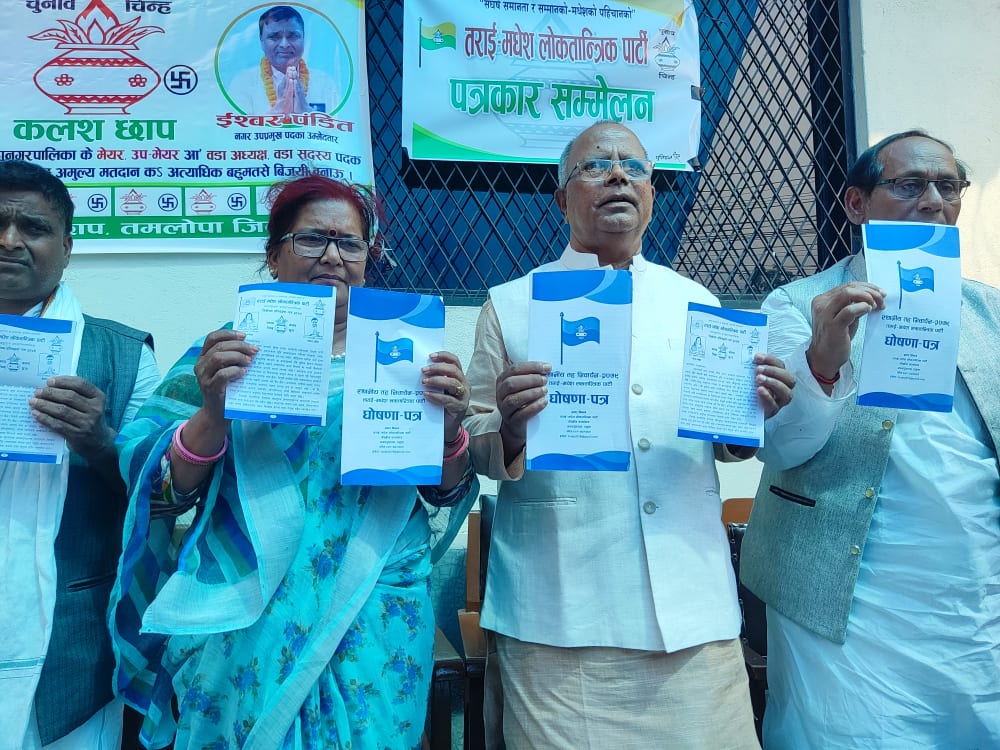 जनकपुरधाम, १८ बैशाख । तराई मधेश लोकतान्त्रिक पार्टीले आसन्न स्थानीय तह निर्वाचन २०७९ का लागि दुई फरक फरक चुनावी घोषणा पत्र सार्वजनिक गरेको छ ।