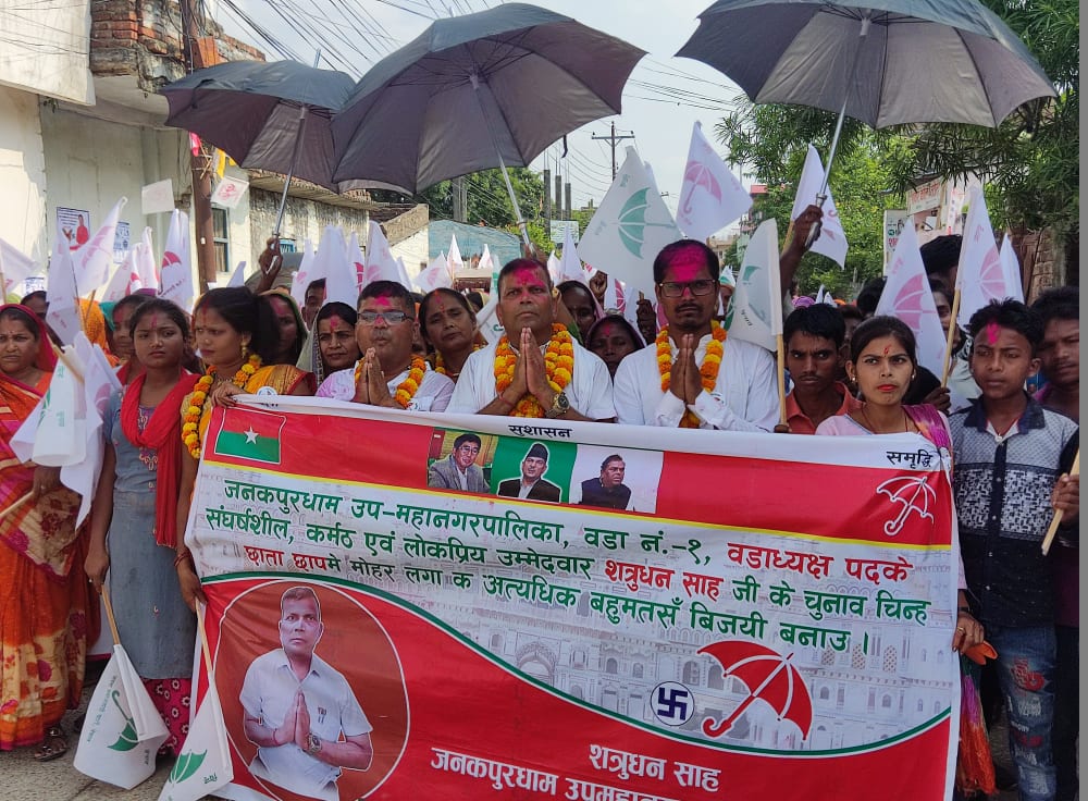 जनकपुरधाम, २१ बैशाख । आसन्न स्थानीय तहको निर्वाचनमा जनकपुरधाम उपमहानगरपालिका वडा नम्बर–१ बाट जसपा नेपालको तर्फबाट वडाध्यक्ष पदका उम्मेदवार शुत्रधन साहले वकिल टोल, रेल्वे स्टेशन एरियामा घरदैलो कार्यक्रम गरेका छन् ।