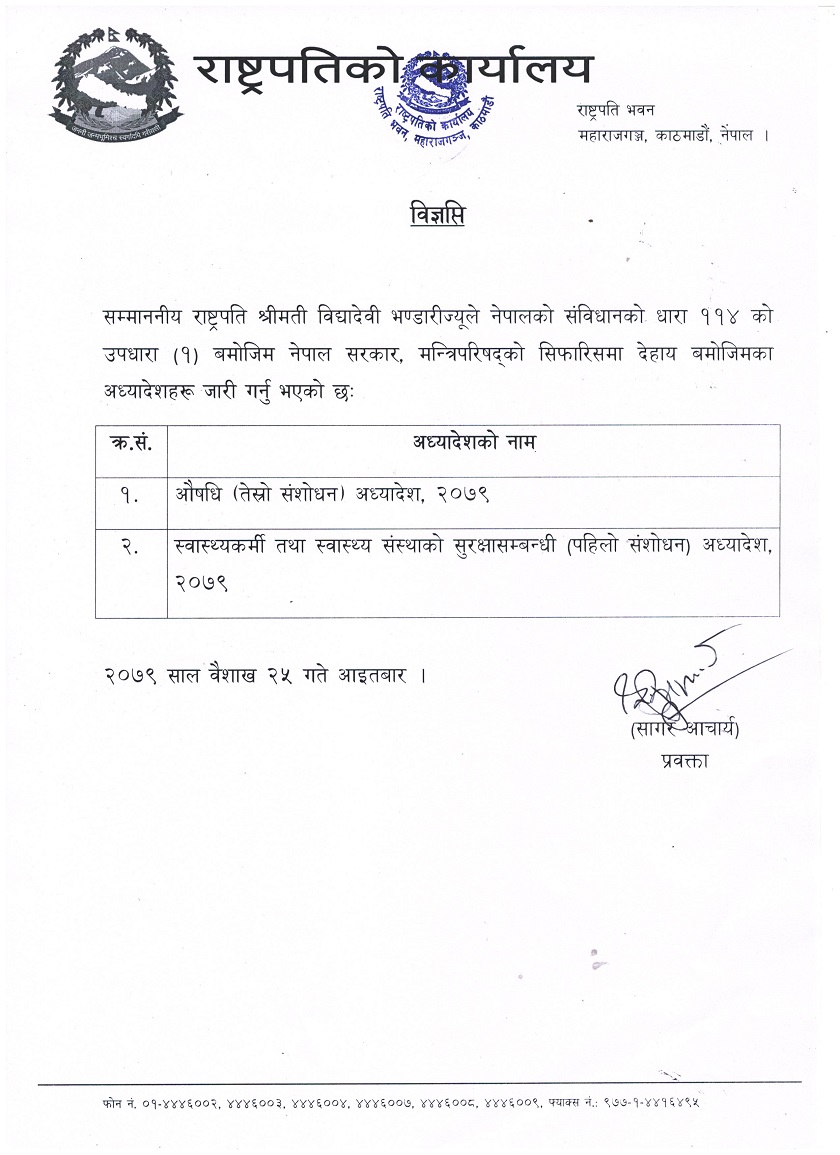 राष्ट्रपति कार्यालयले जारी गरेको विज्ञप्तिमा औषधि (तेस्रो संशोधन) अध्यादेश र स्वास्थ्यकर्मी तथा स्वास्थ्य संस्थाको सुरक्षासम्बन्धी (पहिलो संशोधन) अध्यादेश स्वीकृत भएको उल्लेख गरिएको छ ।