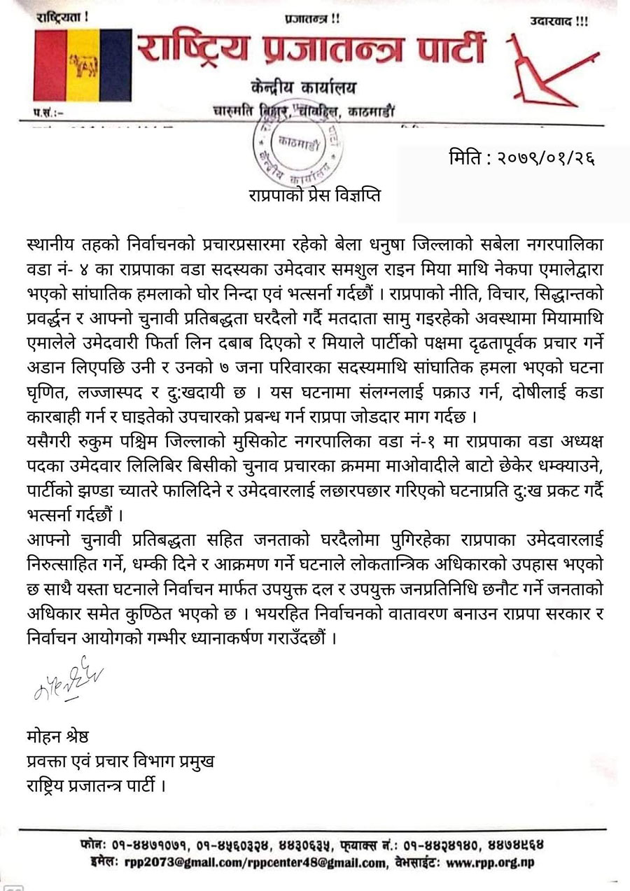 प्रचार विभाग प्रमुख मोहन श्रेष्ठले सोमबार विज्ञप्ति जारी गर्दै धनुषा जिल्लाको सबैला नगरपालिका वडा नं. ४ का राप्रपाका वडा सदस्यका उमेदवार समशुल राइन मियामाथि नेकपा एमालेबाट सांघातिक हमला भएको भन्दै निन्दा गरेका छन् ।