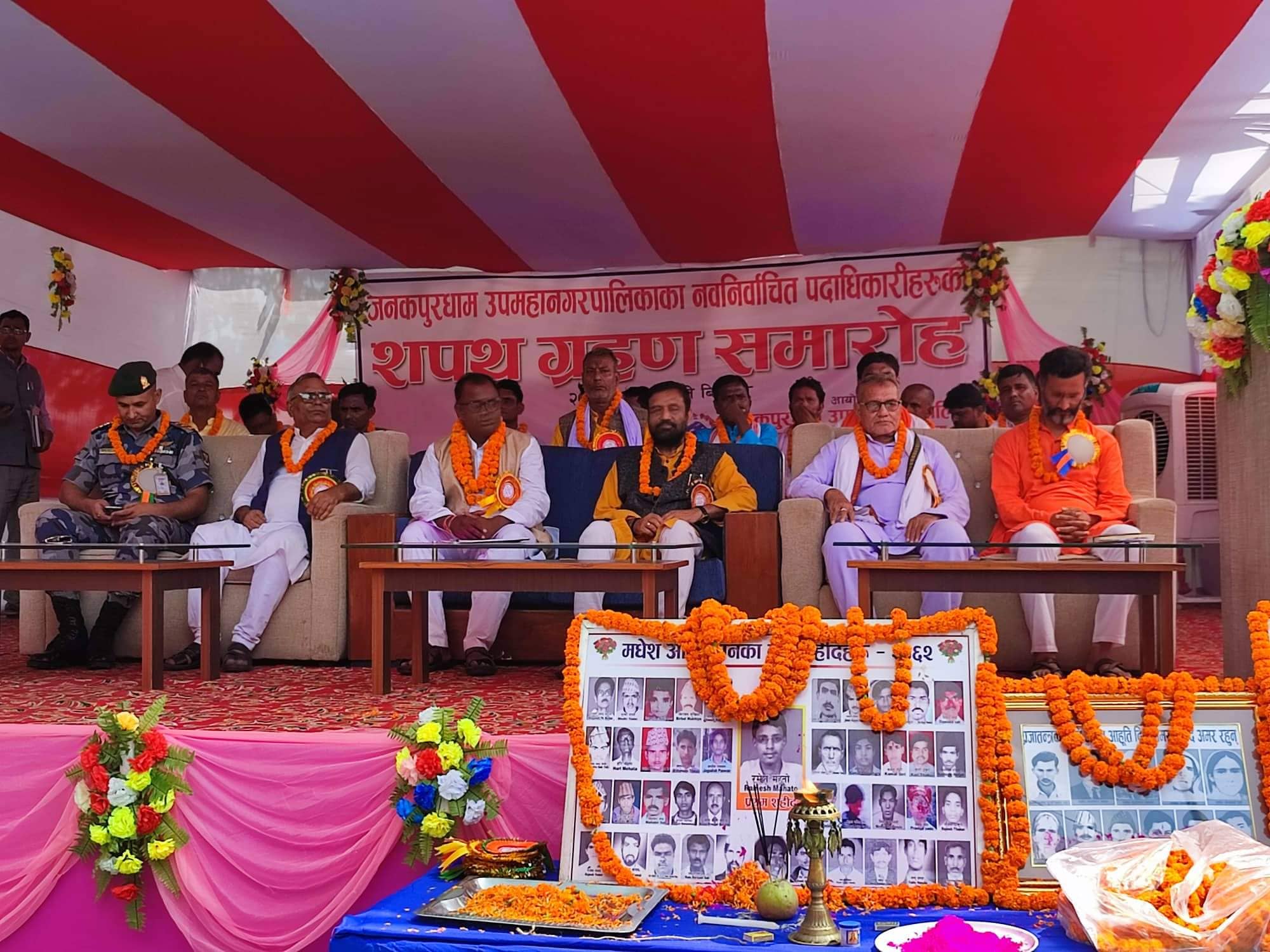 जनकपुरधाम, १२ जेठ । जनकपुरधाम उपमहानगरपालिकाको नवनिर्वाचित जनप्रतिनिधिहरुले पद तथा गोपनियताको शपथ लिइरहँदा नेकपा एमालेबाट निर्वाचित जनप्रतिनिधिहरुले सो कार्यक्रम बहिष्कार गरेका छन् ।