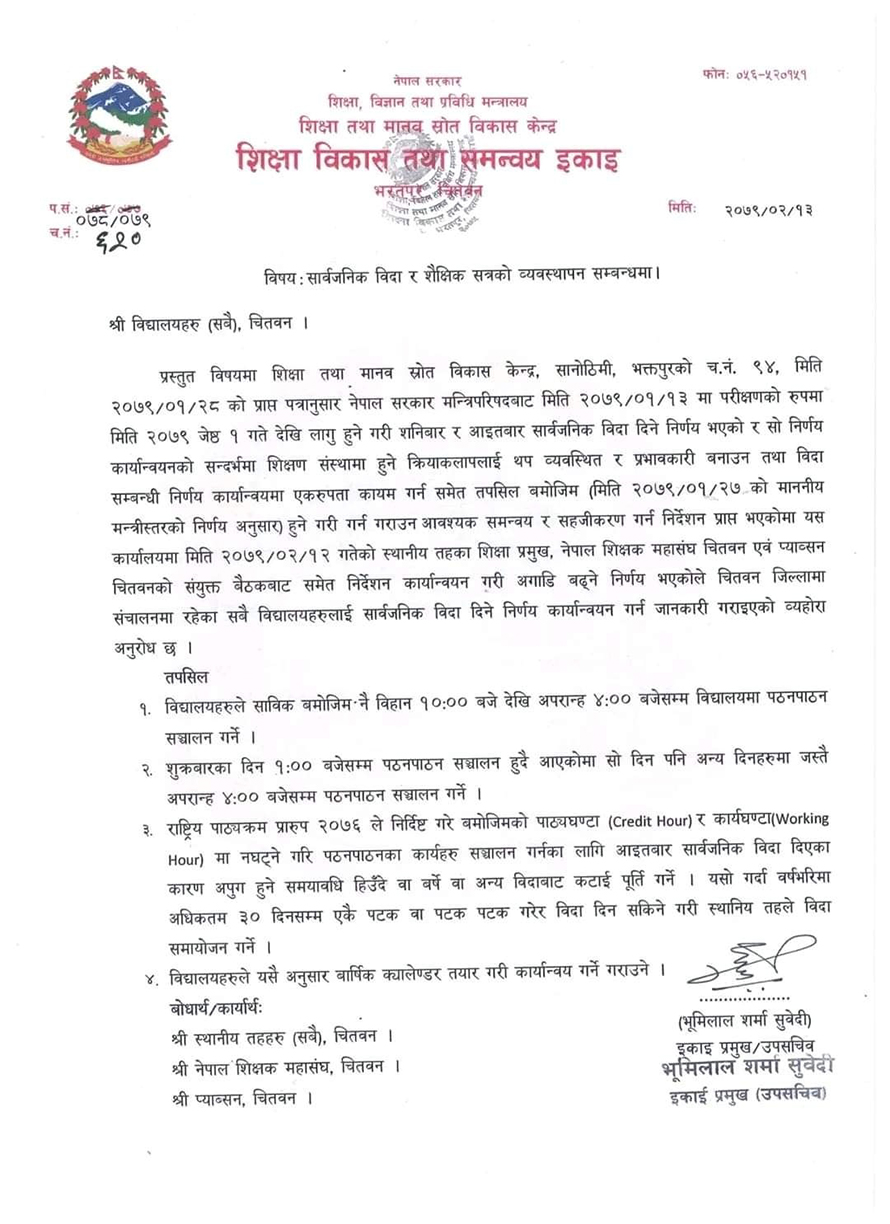 चितवनका विद्यालयमा हप्ताको दुई दिन बिदा