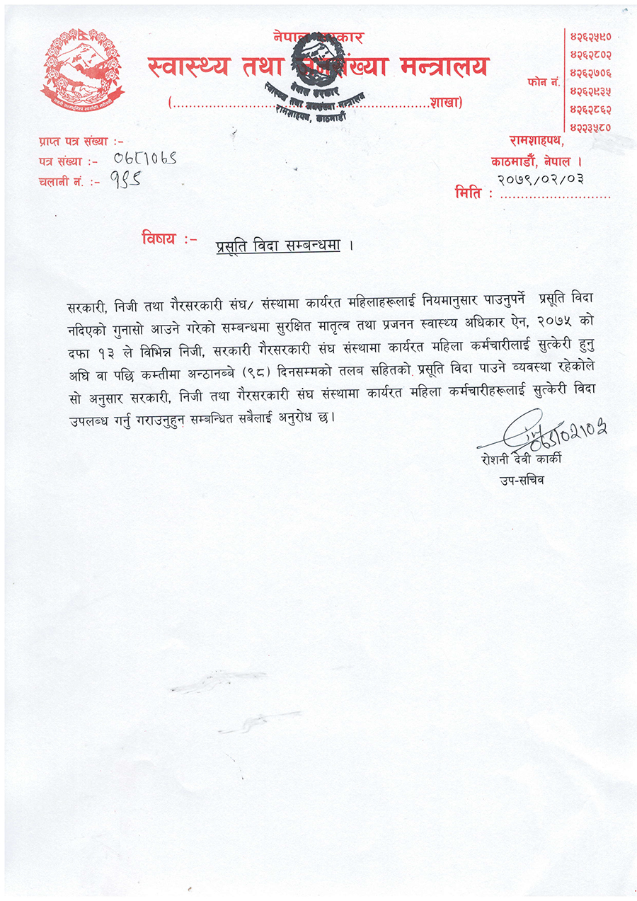 मन्त्रालयले सरकारी, निजी तथा गैरसरकारी संघ संस्थामा कार्यरत महिलाले नियमअनुसार पाउनुपर्ने प्रसूति विदा नपाएको गुनासो आएको भन्दै बुधबार एक सूचना जारी गरी बिदा कडाइका साथ कार्यान्वयन गर्न निर्देशन दिएको हो ।