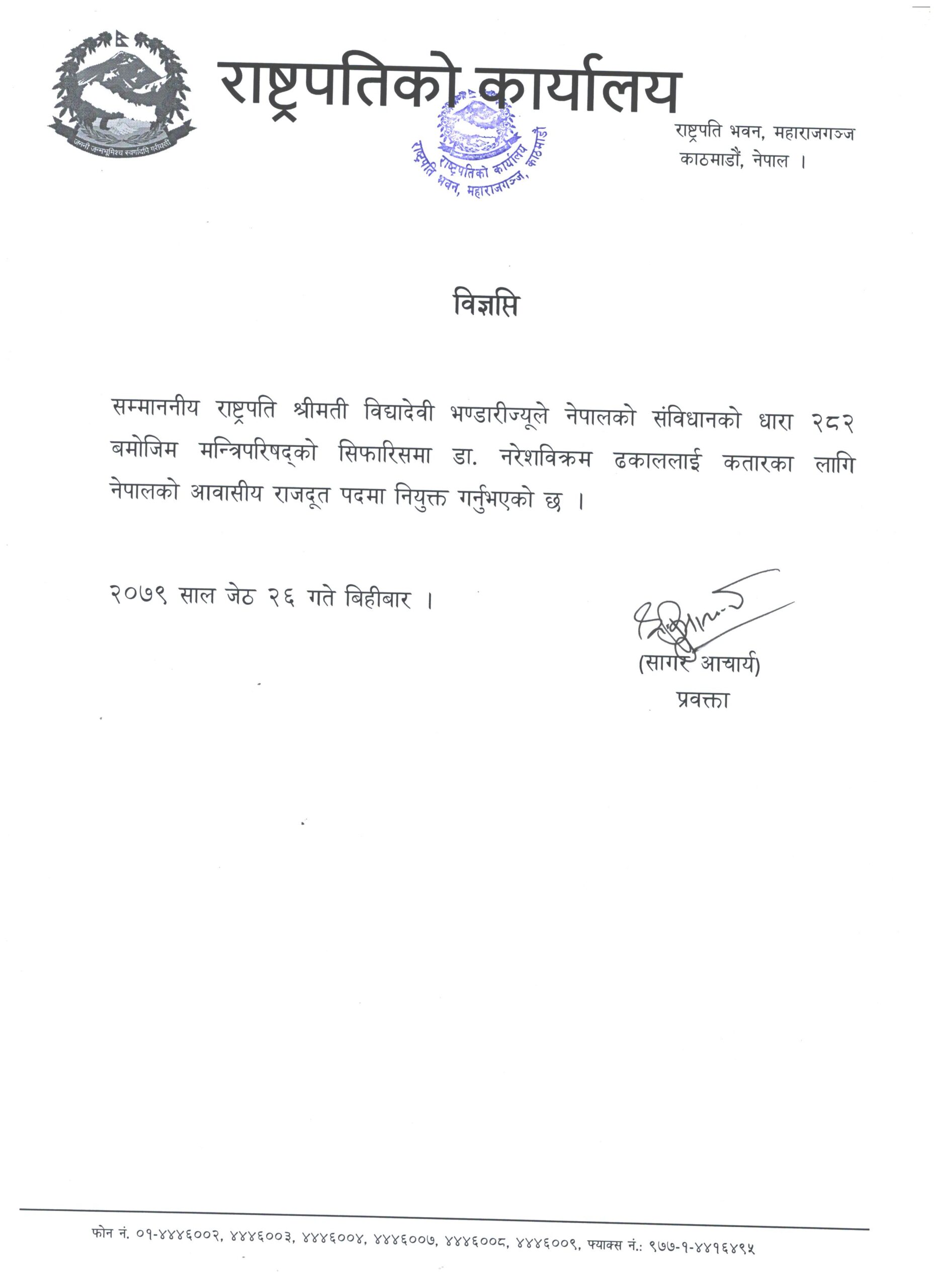 राष्ट्रपति कार्यालयका प्रवक्ता सागर आचार्यका अनुसार नेपालको संविधानको धारा २८२ बमोजिम राष्ट्रपतिले ढकाललाई आवासीय राजदूत पदमा नियुक्त गरेकी हुन् ।