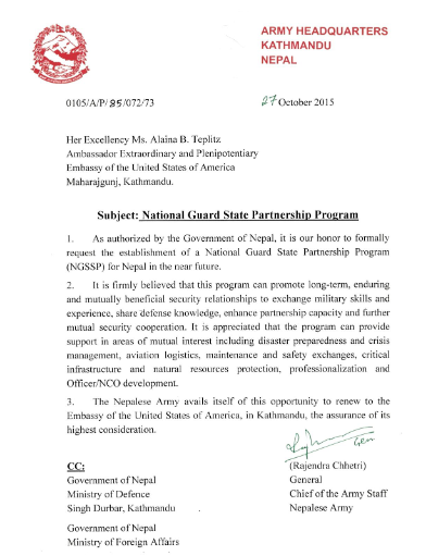 एसपिपीमा सहभागी हुन सेनाले अमेरिकालाई लेखेको पत्र सार्वजनिक
