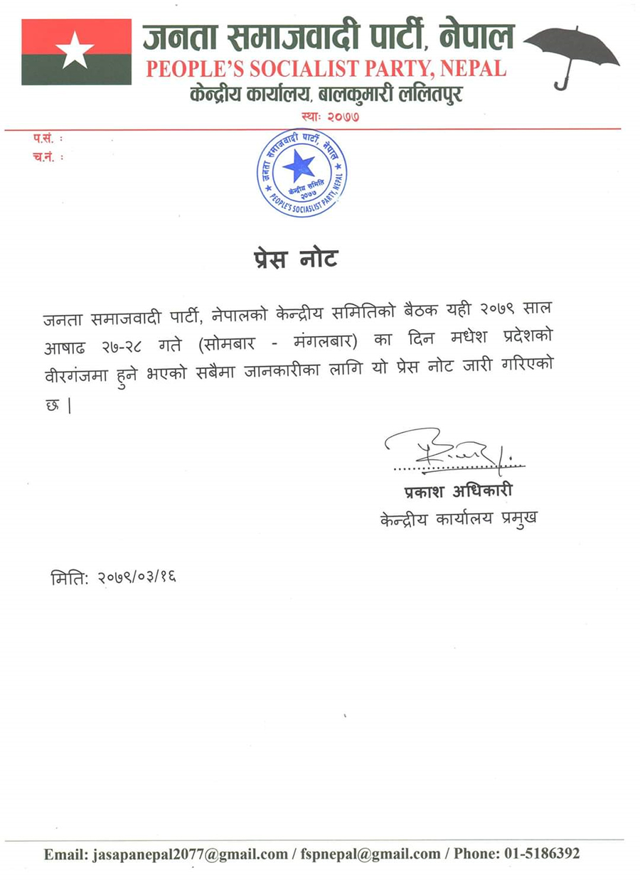 काठमाडौं, १६ असार । जनता समाजवादी पार्टीले केन्द्रीय समितिको बैठक बोलाएको छ ।