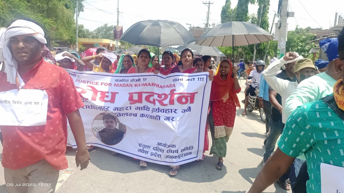 संयुक्त दलित संघर्ष समितिले प्रधानाध्यापक महरालाई कालोमोसो गरी दुर्व्यवहार गरिएको घटनामा संलग्न दोषीहरुले सजाय पाउनु पर्ने माग गर्दै प्रदर्शन गरेको हो ।