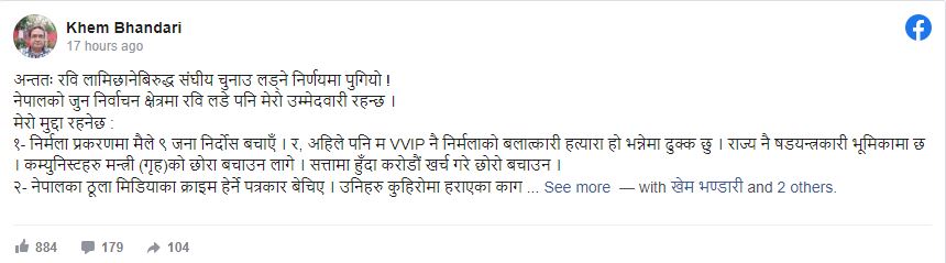 उनले लेखेका छन्, ‘एक नालिक छोरीको अस्मिता र प्राण हरण गर्ने राक्षसहरू र ती राक्षस बचाउने मतियारको गुलाम हो रवि लामिछाने ! त्यसैले रवि लड्ने क्षेत्रमा मेरो उम्मेदवारी रहनेछ ।’