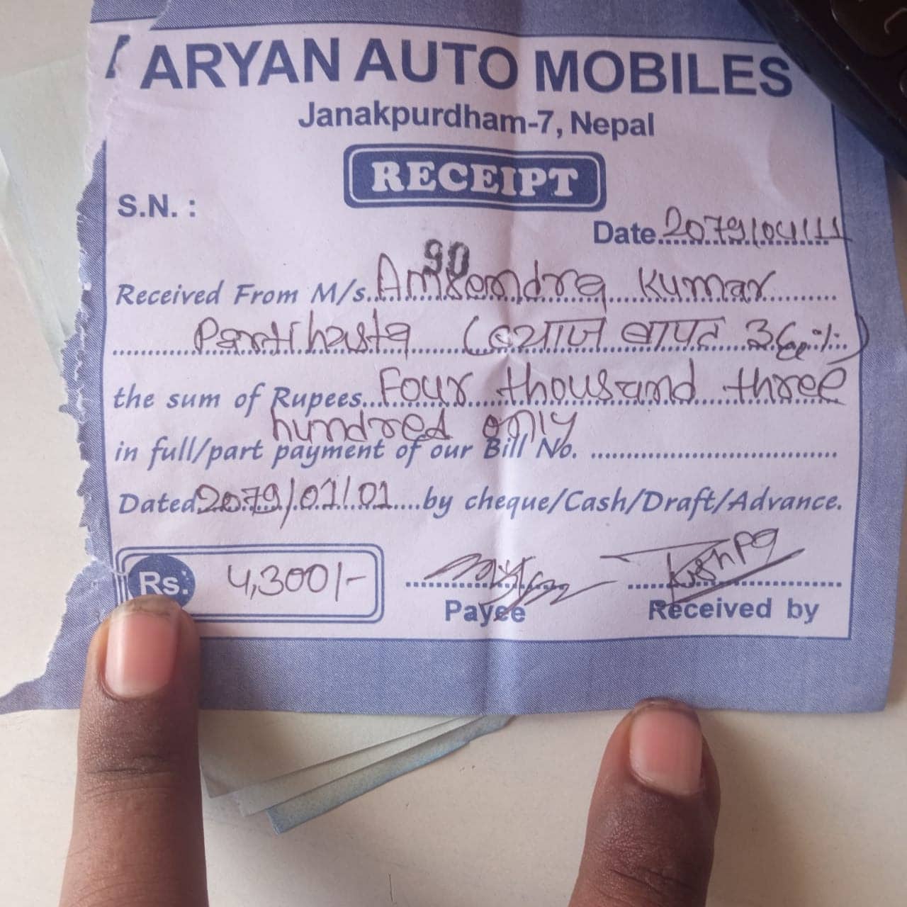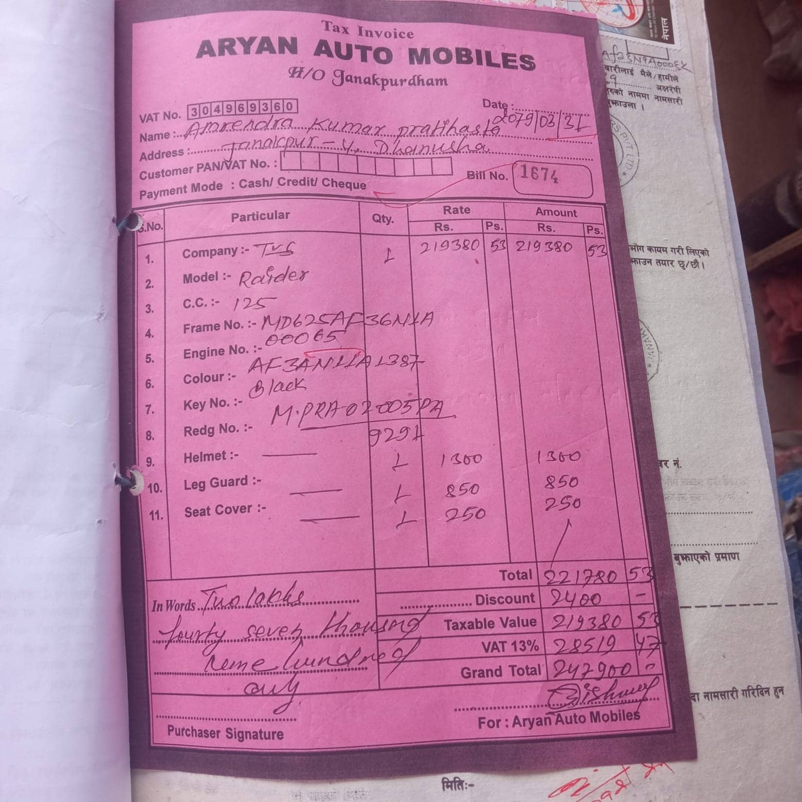 गत बैशाख १ गते जनकपुरधाम–७ स्थित आर्यन अटो मोबाइल्सबाट अमरेन्द्रले २ लाख ४७ हजार ९ सय रुपैयाँमा टिभिएसको राइडर १२५ सिसि मोटरसाइकल खरिद गरे । उनले गाडी खरिद गर्ने बेलामा २ लाख रुपैयाँ शो–रुमका कर्मचारी चन्दनलाई दिए । बाँकी रहेको ४७ हजार ९ सय रुपैयाँ दुई महिनाभित्र तिर्ने उनीहरुबिच सहमति भयो ।