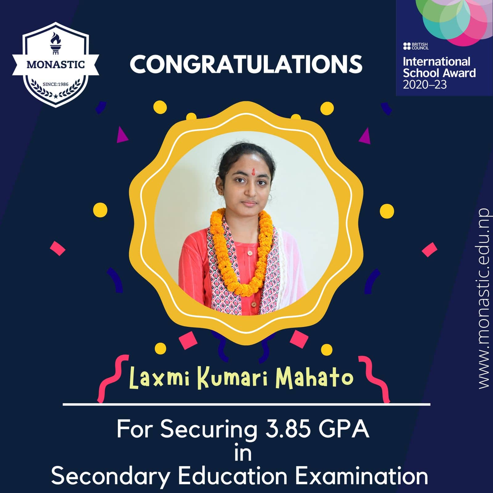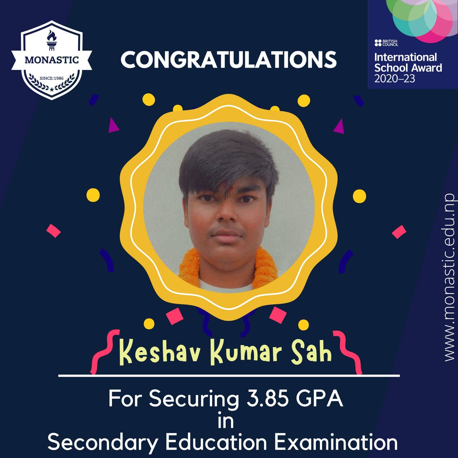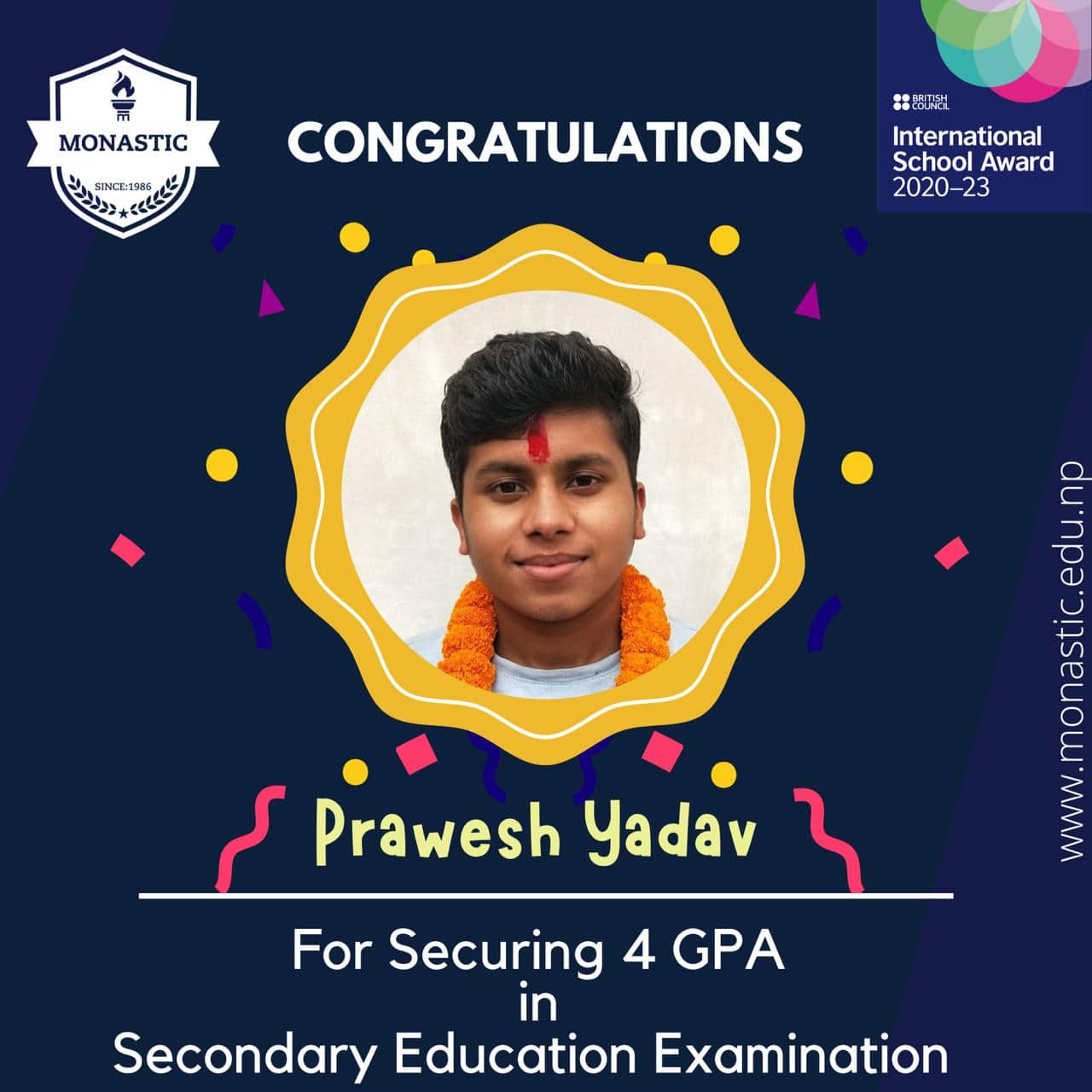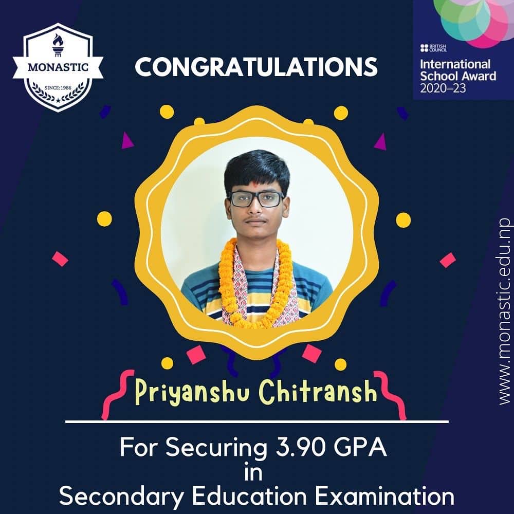 डा. साहले देशभरीमा ४२ जना विद्यार्थीले ४ जीपीए ल्याएकोमा त्यसमध्ये मोनाष्टिकका छात्र प्रवेश पनि एक रहेको बताए । प्रवेशले मधेस प्रदेशभरिमै सर्वोत्कृष्ट नतिजा ल्याएको सञ्चालक साहले बताए ।