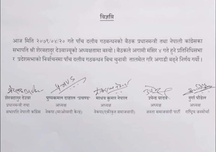 पाँच दलीय गठबन्धनद्वारा सिट बाँडफाँड गर्न ११ सदस्यीय कार्यदल गठन