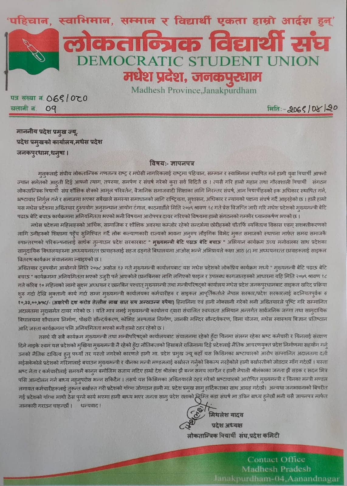 लोकतान्त्रिक विद्यार्थी संघका प्रदेश अध्यक्ष मिथलेश यादवको संयोजकत्वमा केन्द्रीय विद्यार्थी नेता रोशन मिश्रको अगुवाई तथा लोकतान्त्रिक युवा संघका जिल्ला अध्यक्ष प्रशान्त झा, सचिव रोशन साह, प्रदेश स्तरीय विद्यार्थी नेता त्रिदेव मिश्र, लोकतान्त्रिक विद्यार्थी संघका धनुषा जिल्ला अध्यक्ष इजाज अन्सारी लगायतका विद्यार्थी नेताहरुको उपस्थितिमा प्रदेश प्रमुख मिश्रलाई ज्ञापनपत्र बुझाइएको छ ।