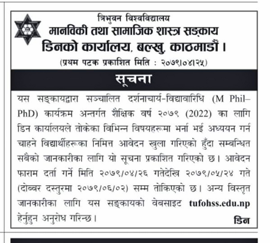 काठमाडौं, २५ साउन । त्रिभुवन विश्वविद्यालय मानविकी तथा सामाजिक शास्त्र संकायको डिन कार्यालयले शैक्षिक वर्ष २०७९ एमफील, पीएचडीको लागि भर्ना आवेदन खुला गरेको छ ।