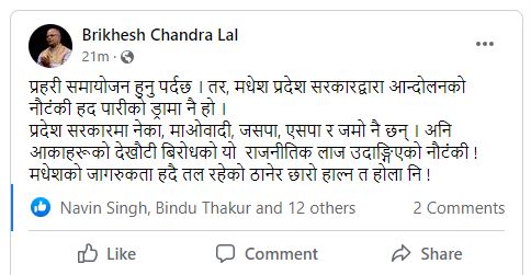 पार्टी अध्यक्ष बृषेशचन्द्र लालले प्रदेश सरकारले भोलि (आइतबार)देखि गर्न लागेको आन्दोलनलाई ड्रामाको संज्ञा दिएका हुन् ।