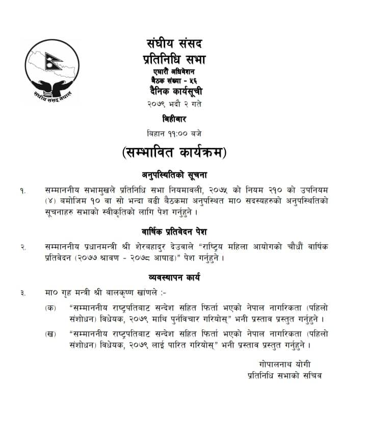 संघीय संसद सचिवालयले बिहीबार बस्ने बैठकको सम्भावित कार्यसूची सार्वजनिक गर्दै यसबारे उल्लेख गरेको हो ।