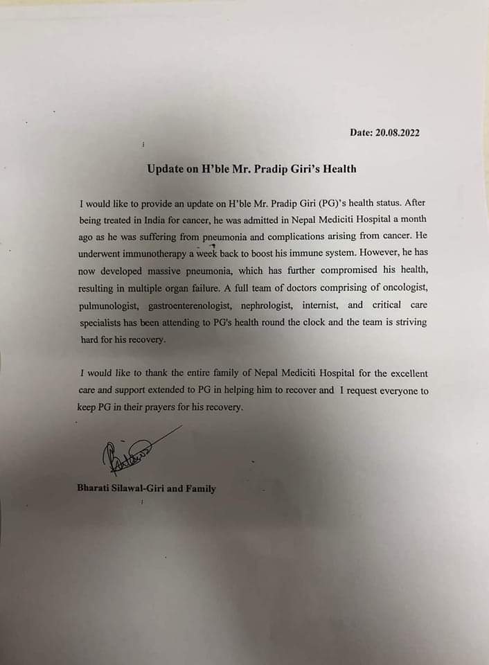 गिरीको पछिल्लो स्वास्थ्य अवस्था बारे भारती सिलवाल गिरीले वक्तव्य जारी गर्दै यस्तो अनुरोध गरिएको हो ।