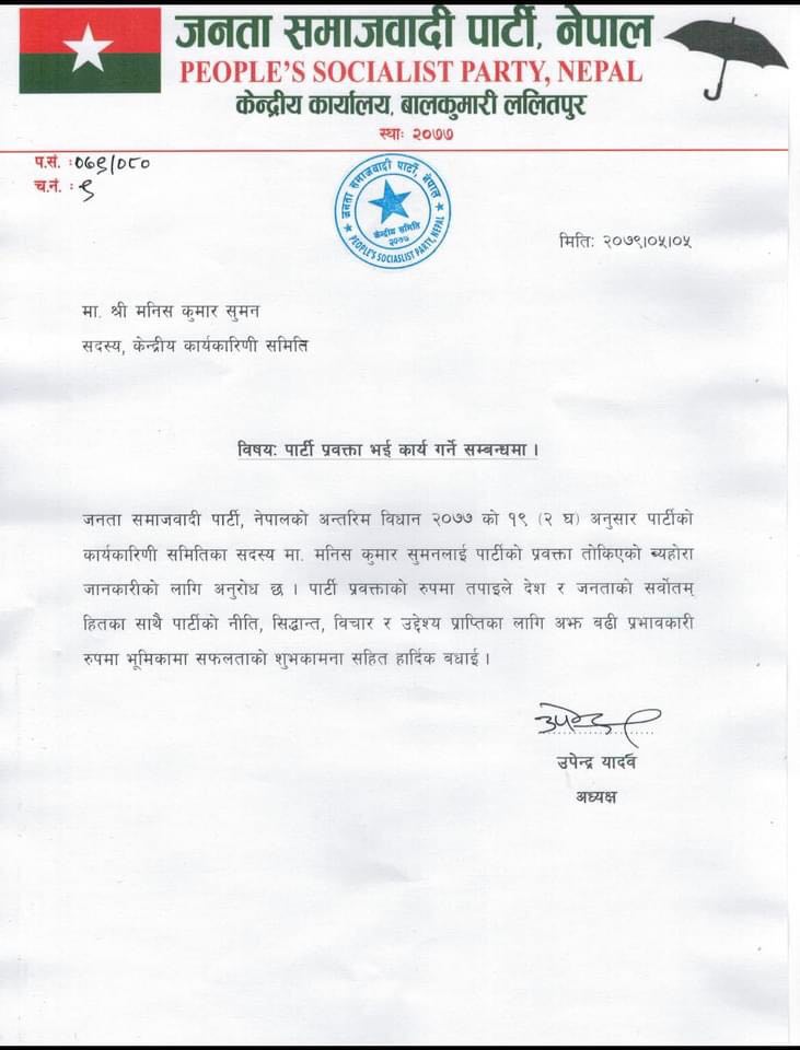 काठमाडौं, ५ भदौ । जनता समाजवादी पार्टीले पार्टी प्रवक्ताको जिम्मेवारी नेता मनीषकुमार सुमनलाई दिएको छ ।