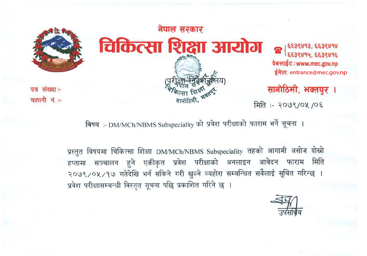 आयोगले मंगलबार सूचना जारी गरी डीएम/एमसीएच/एनबीएमएस सबस्पेसियालिटीको एकीकृत प्रवेश परीक्षाबारे जानकारी दिएको हो ।