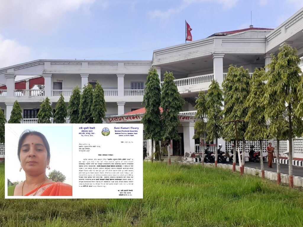 जनकपुरधाम, १२ भदौ । प्रदेशसभा सदस्य रानी शर्मा तिवारीले मधेस प्रदेशको प्रदेशसभाको संसदीय अनुगमन विशेष समितिको सदस्य पदबाट राजीनामा दिएकी छन् ।