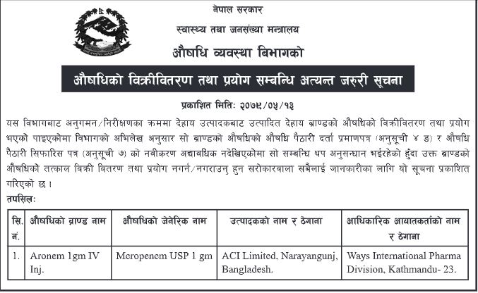 औषधि व्यवस्था विभागले Meropenem USP 1 gm जेनेटिक नाम भएको Aronem 1gm IV नामको औषधि नेपालका विक्रिवितरण र प्रयोगमा रोक लगाएको हो ।