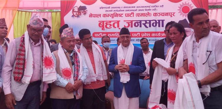 कार्यक्रममा विभिन्न पार्टी परित्याग गरेर एमालेमा आएका नेता कार्यकर्तालाई ओलीले टीका लगाएर स्वागत गरेका थिए ।