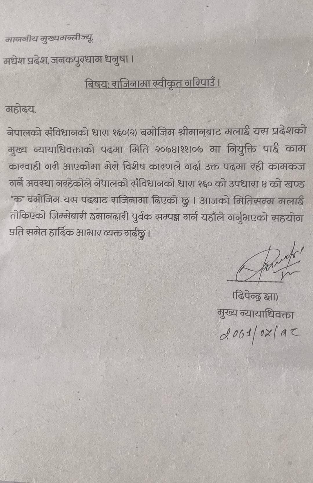 जनकपुरधाम, १८ भदौ । आगामी मंसिर ४ गते हुने प्रतिनिधिसभाको निर्वाचन लड्नका लागि मधेस प्रदेशका मुख्यन्यायाधिवक्ता दीपेन्द्र झाले शनिबार पदबाट राजीनामा दिएका छन् ।