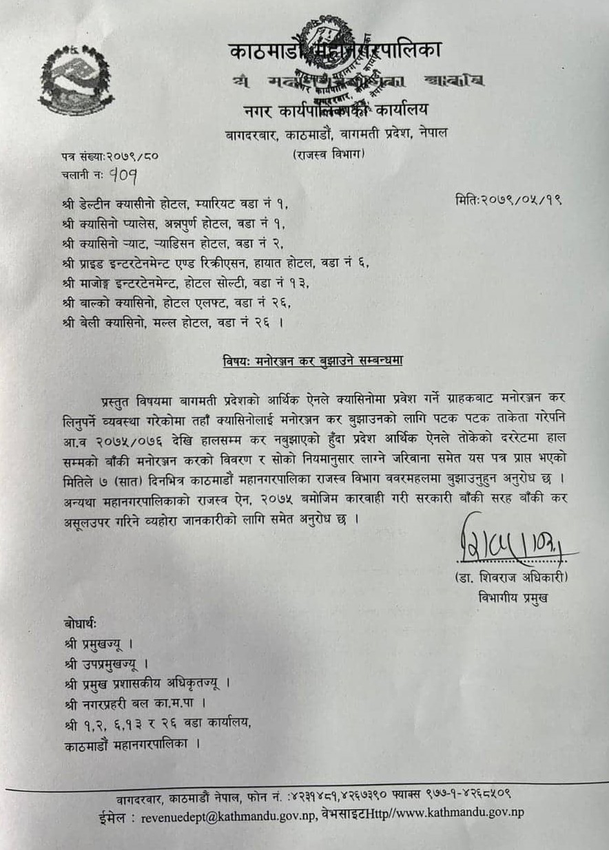 सात दिनभित्र मनोरञ्जन कर तिर्न क्यासिनोहरूलाई महानगरको सूचना