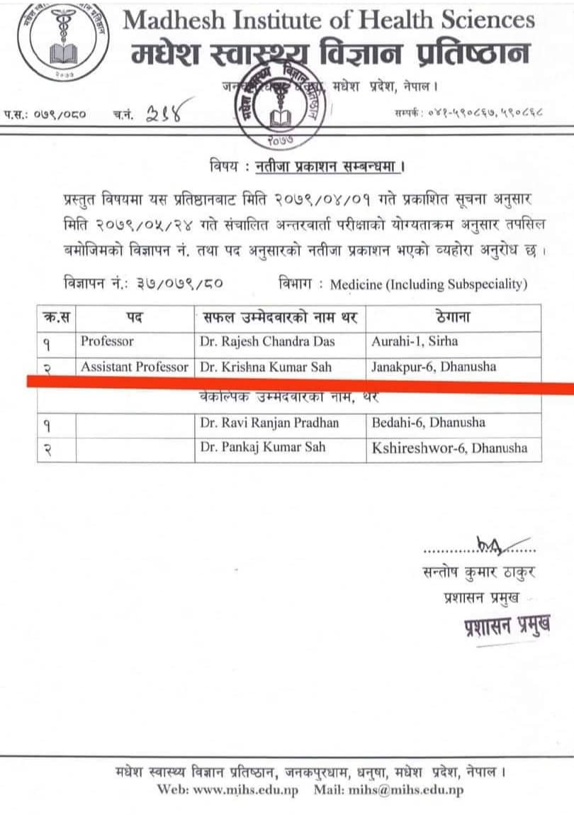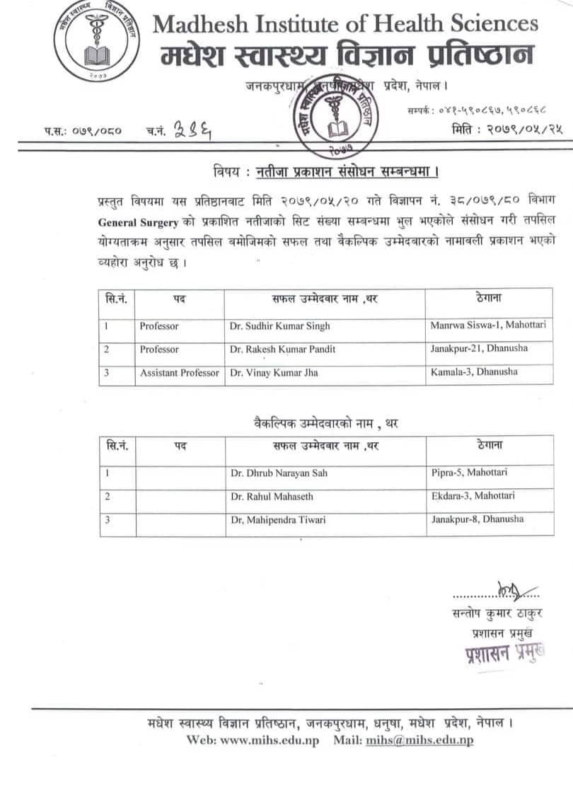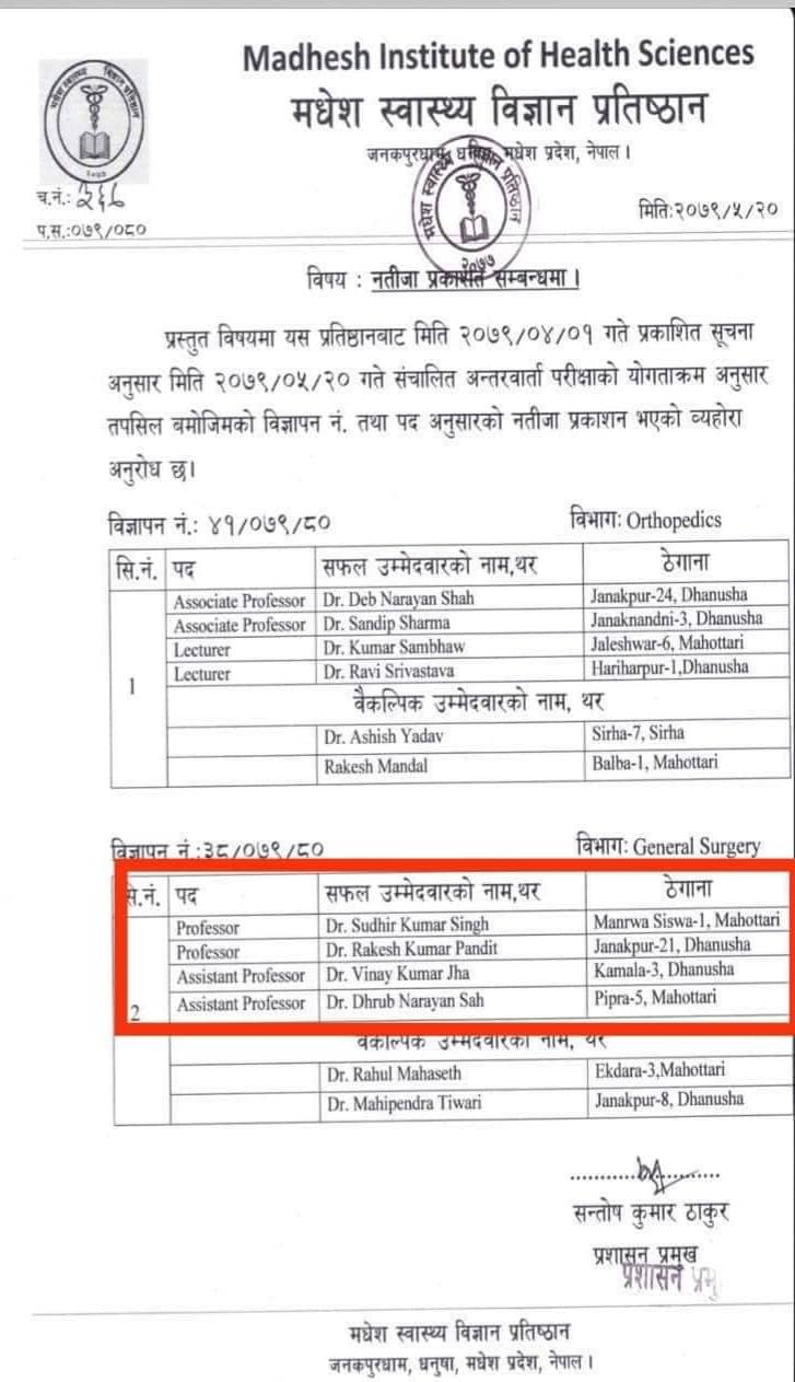 पहिलोपटक भदौ २० गते नतिजा प्रकाशन गर्दा प्रोफेसर डा.सुधिर कुमार सिंह र डा. राकेश कुमार पण्डित तथा असिस्टेन्ट प्रोफेसर डा. विनय कुमार साह र डा. ध्रुव नारायण साहको नाम निकालिएको थियो । जबकी साउन १ गते प्रकाशित सूचना अनुसार सो पदमा माग