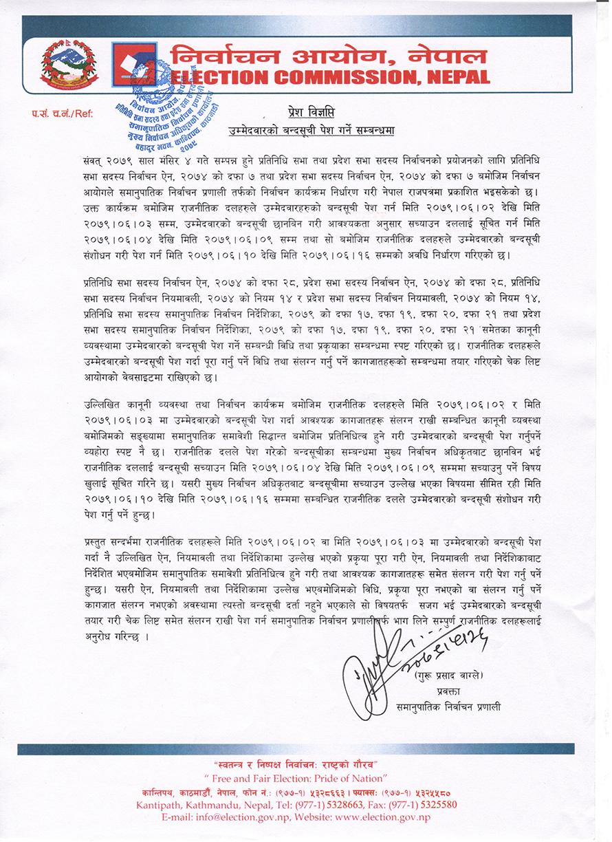 समानुपातिकतर्फको बन्दी सूची बुझाउने समय असोज २ र ३ गते