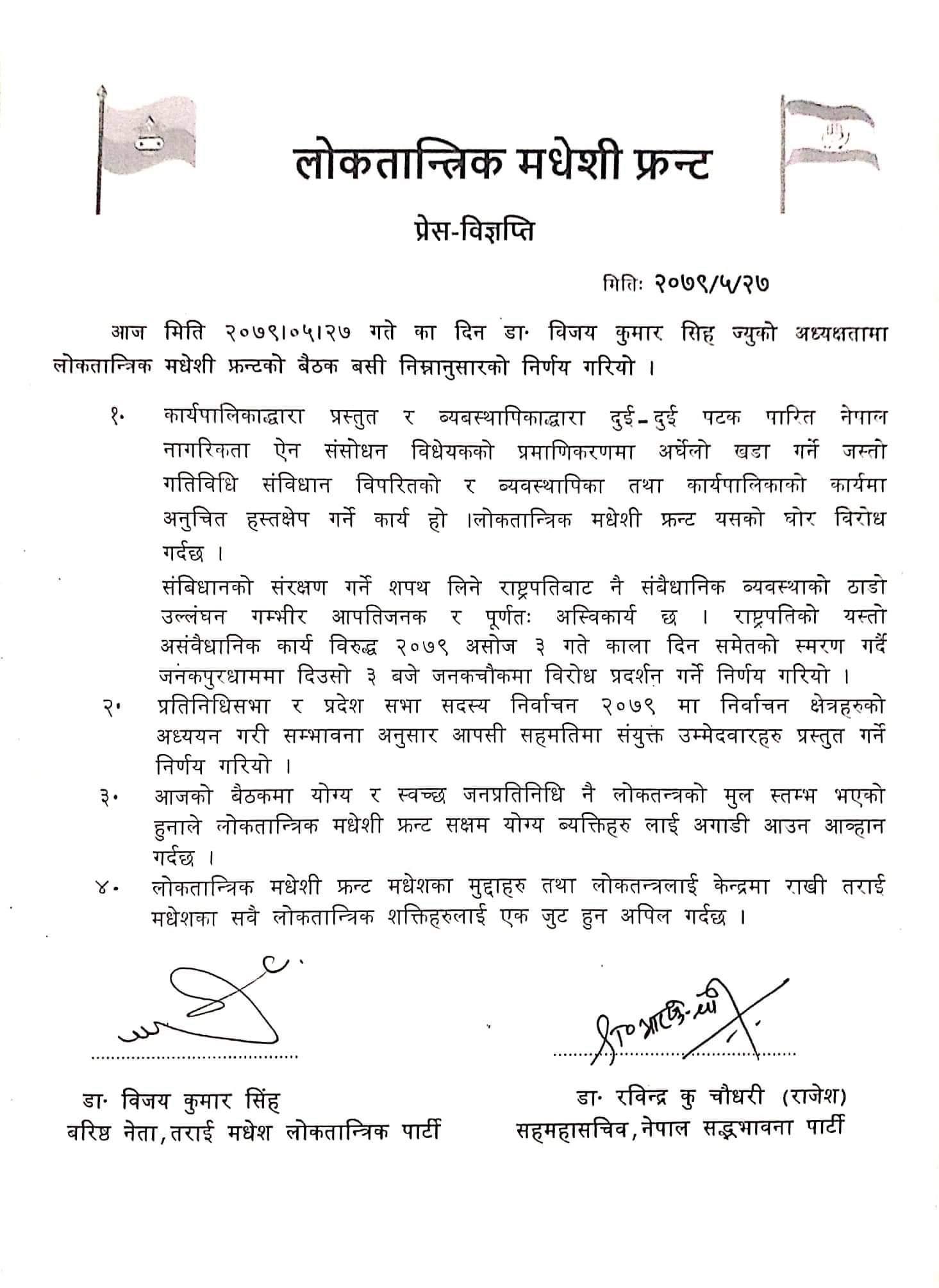 फ्रन्टले राष्ट्रपतिको यस्तो असंवैधानिक कार्यविरुद्ध २०७९ असोज ३ गते काला दिन समेतको स्मरण गर्दै जनकपुरधाममा दिउँसो ३ बजे जनकचोकमा विरोध प्रदर्शन गर्ने निर्णय गरेको छ ।