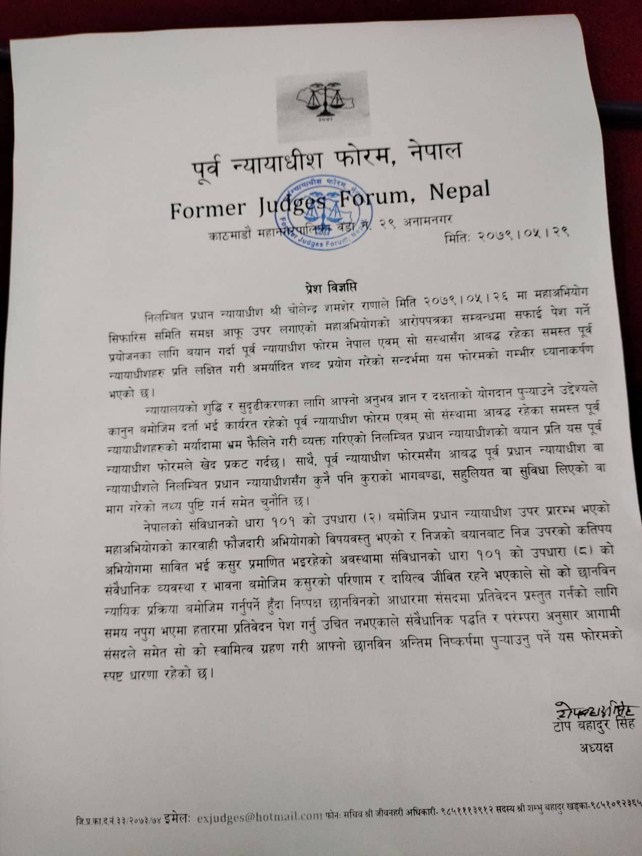 विज्ञप्तिमा भनिएको छ, ‘निलम्बित प्रधानन्यायाधीशको बयानप्रति पूर्वन्यायाधीश फोरमले खेद प्रकट गर्दछ । साथै, पूर्वन्यायाधीश फोरमसँग आवद्ध पूर्वप्रधानन्यायाधीश वा न्यायाधीशले निलम्बित प्रधानन्यायाधीशसँग कुनै पनि कुराको भागबण्डा, सहुलियत वा सुविधा लिएको वा माग गरेको तथ्य पुष्टि गर्नसमेत चुनौती छ ।’
