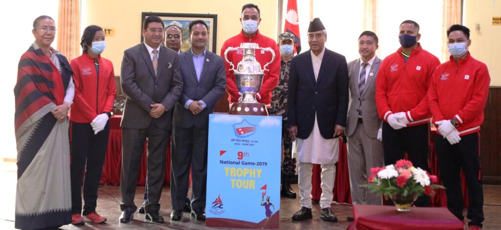 प्रधानमन्त्री देउवाद्वारा नवौँ राष्ट्रिय खेलकुदका लागि तयार गरिएको ट्रफी सार्वजनिक